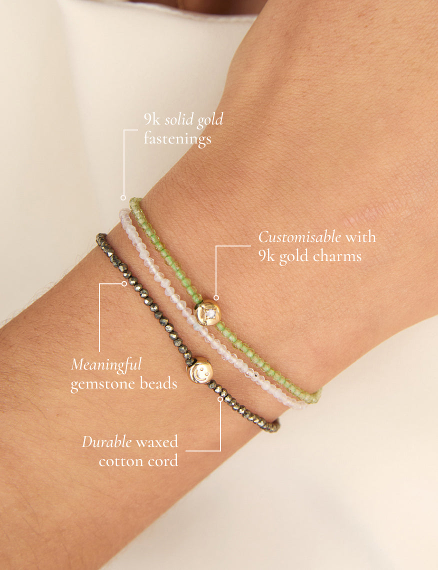 Meet the Gemstone Bracelets. Energize your stack with healing gemstones, and tell your own story by customising with a choice of 9k gold charms.