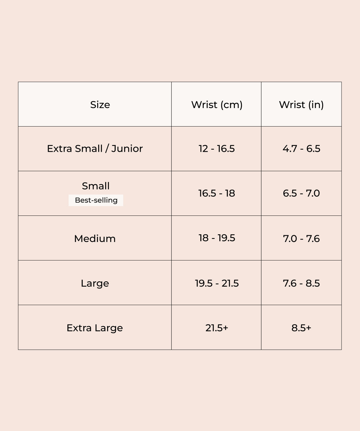 Most of our bracelets come in a range of sizes, ranging from small-extra large, so you can find a bracelet to fit you! Curate the perfect wrist stack and find the perfect fit.