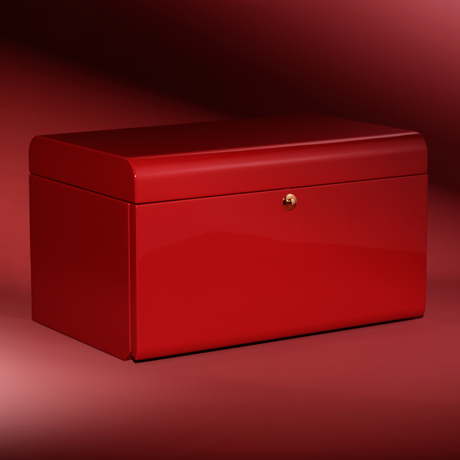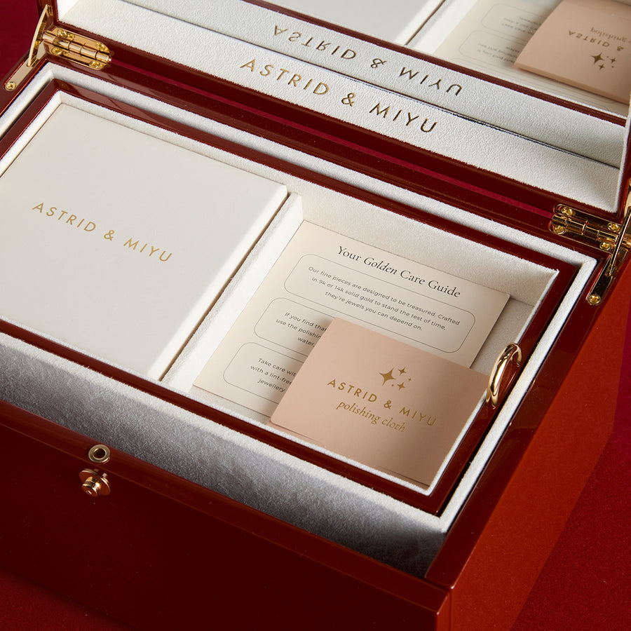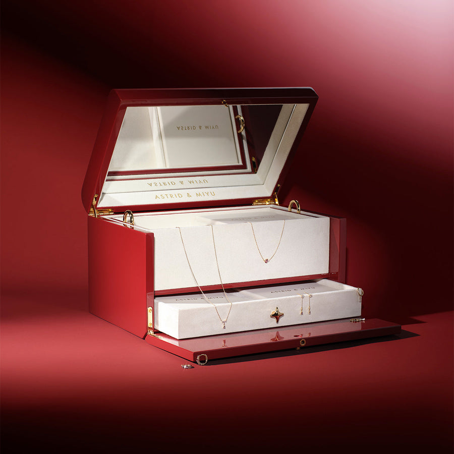 In a lacquered deep red finish with a suedette interior, our Solid Gold Calendar doubles as a jewellery box to use all year round. Completed with a mirror and gold-toned finishes to the star of any dressing table.