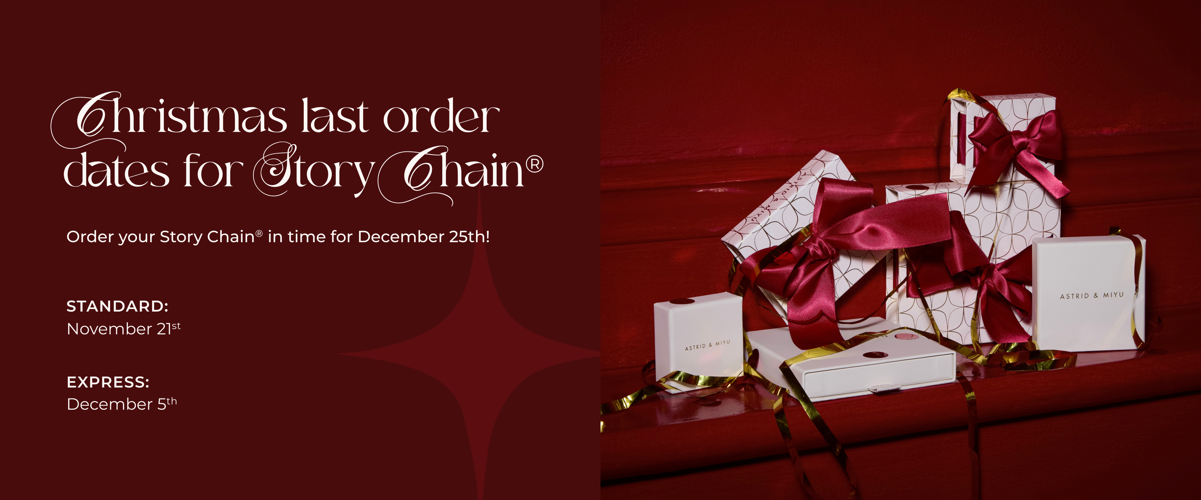 As this is a bespoke service, you’ll receive your Story Chain® after five weeks with no additional charge for Standard Service. If you’d like to receive it sooner, you can choose our Express Service for a $40 fee (on top of the cost of your chosen chains and charms), which reduces delivery time to three weeks.