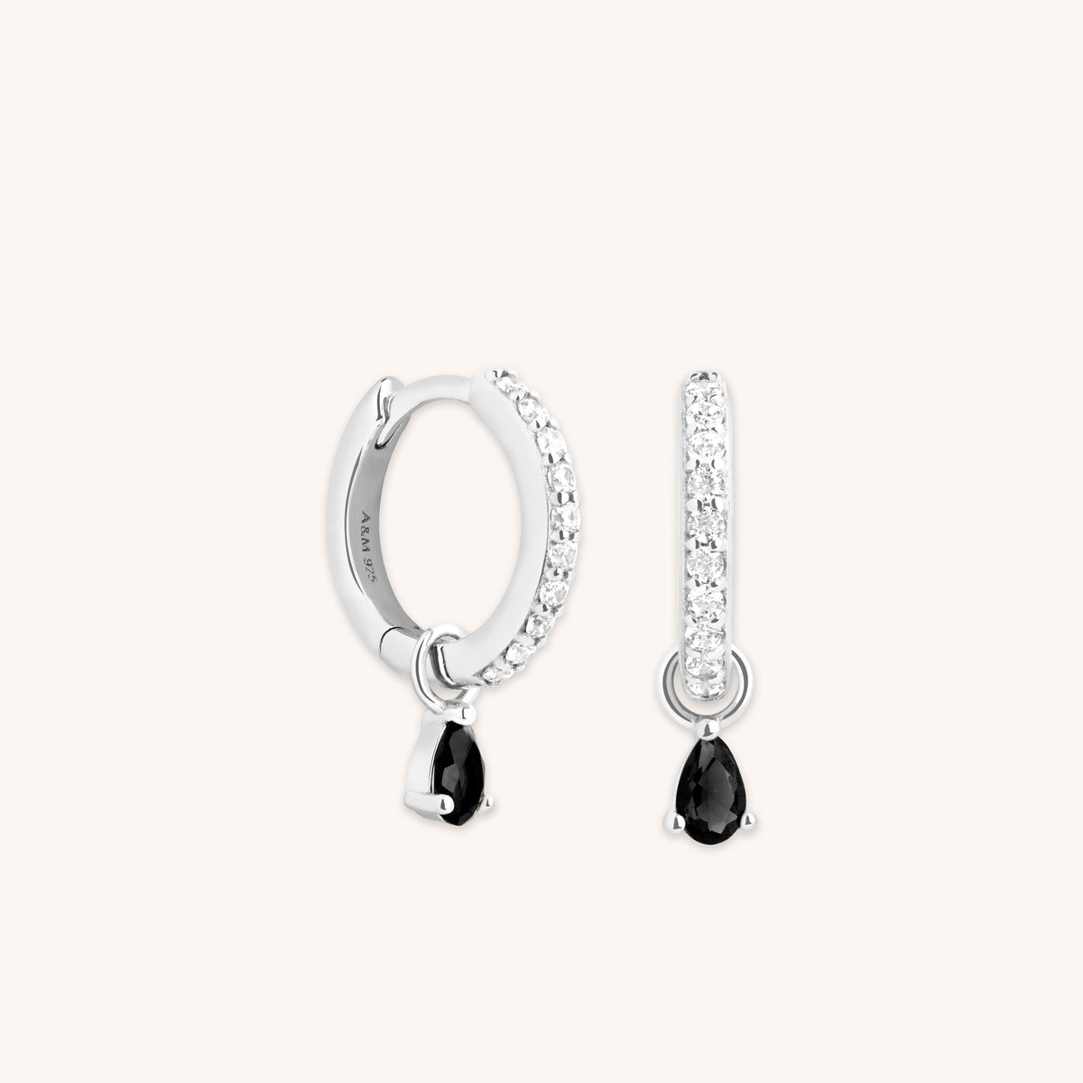 Black Pear Charm Huggies in Silver