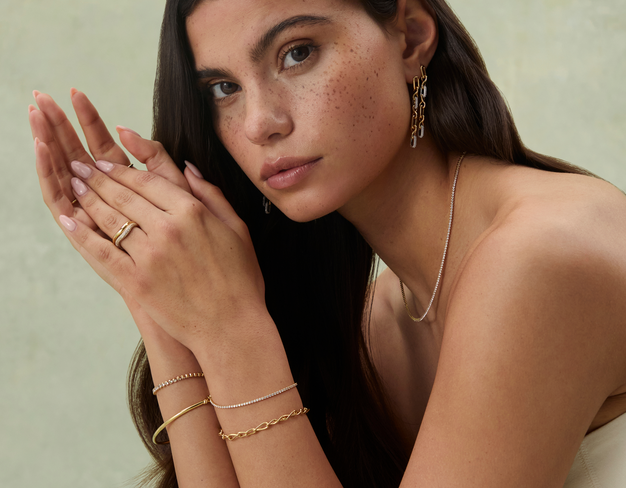 Coated in Solid Gold or Platinum PVD, which is added through a molecular bonding process. It's resistant to chipping and fading, so your jewels can stay shining all day, every day.