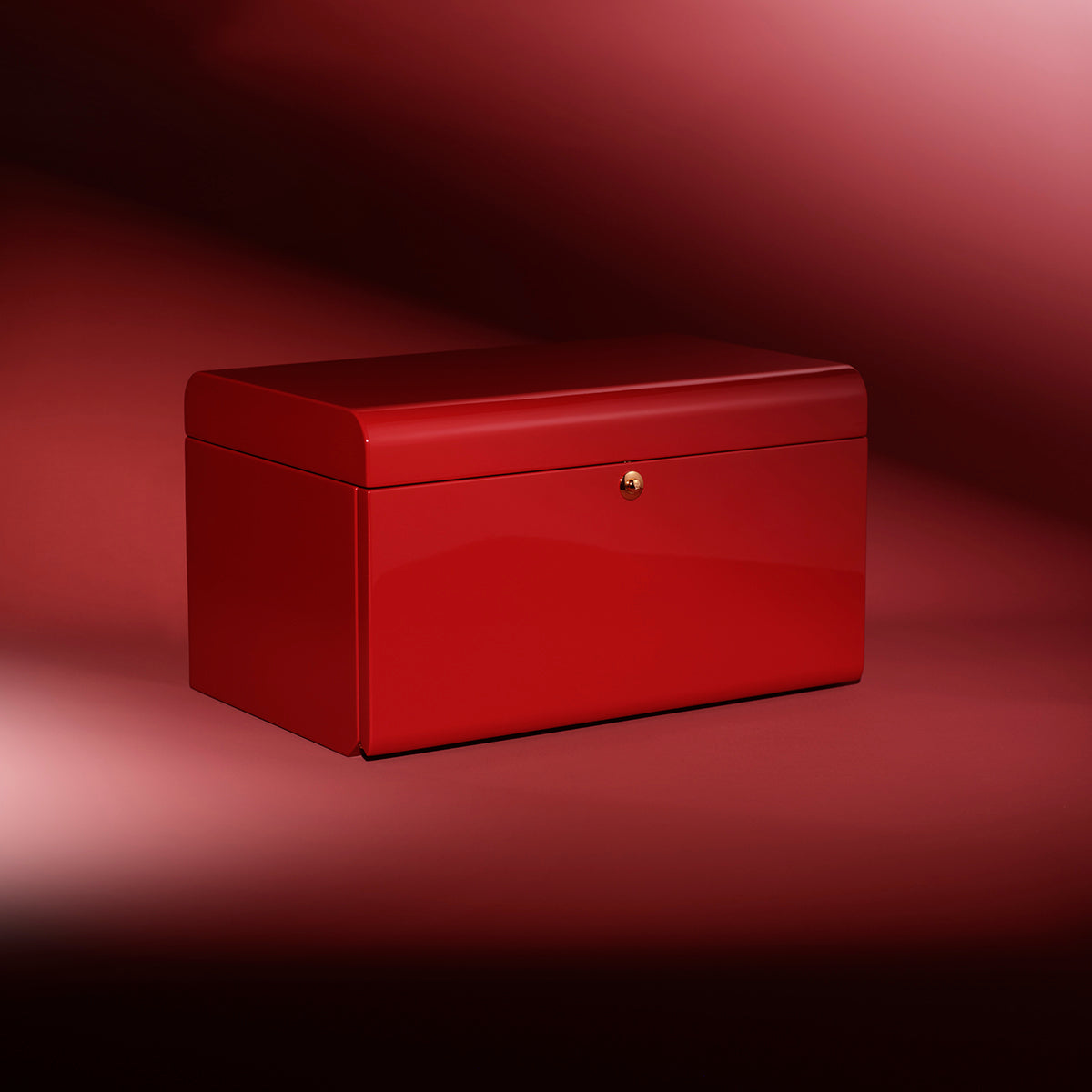 In a lacquered deep red finish with a suedette interior, our Solid Gold Calendar doubles as a jewellery box to use all year round. Completed with a mirror and gold-toned finishes to the star of any dressing table.